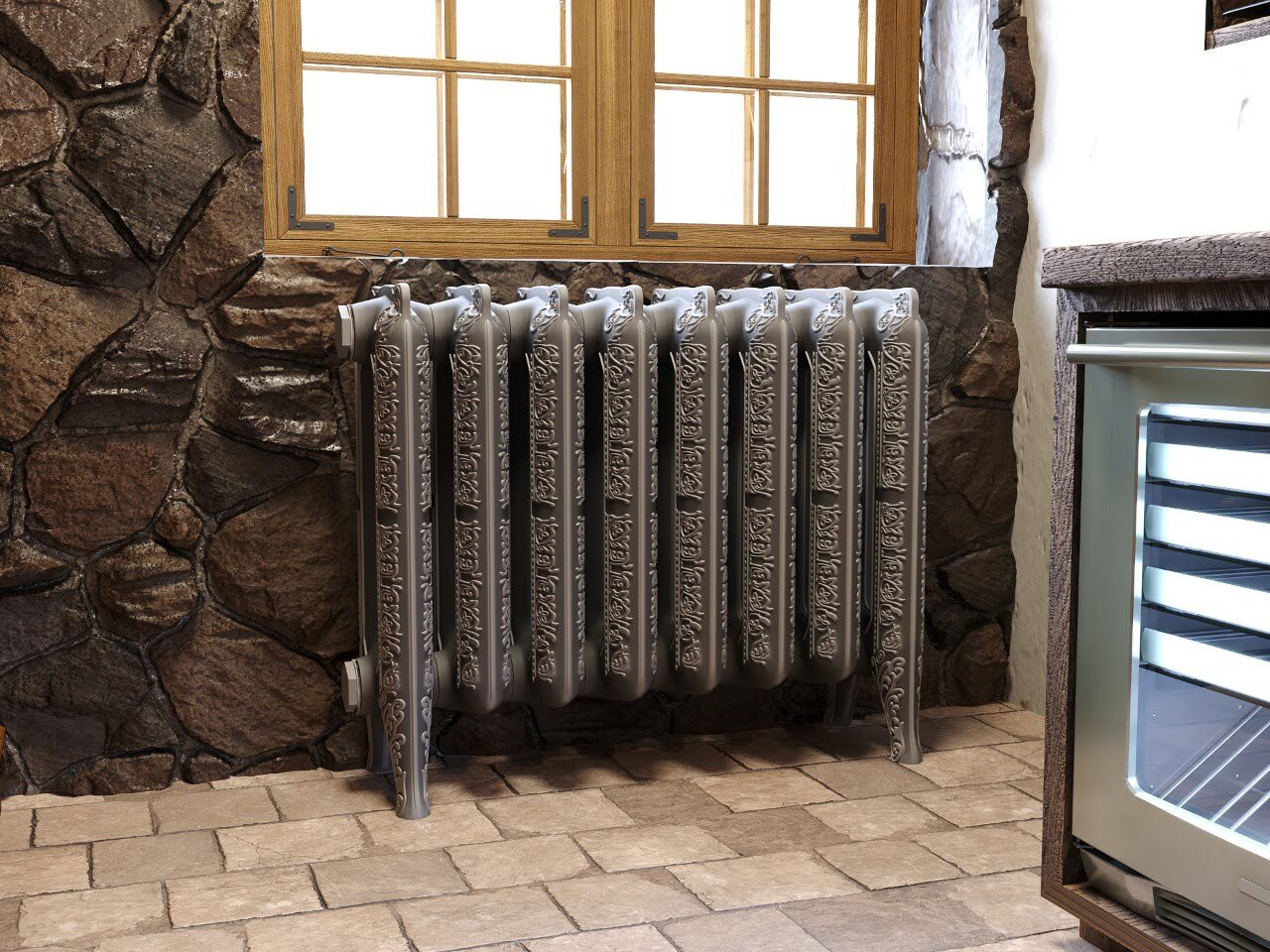 Декоративный орнамент на поверхностях чугунного радиатора, созданный методом художественного литья, натуральные цвета, оригинальная обработка поверхности несомненно, добавляют жилому пространству эксклюзивность и стиль.